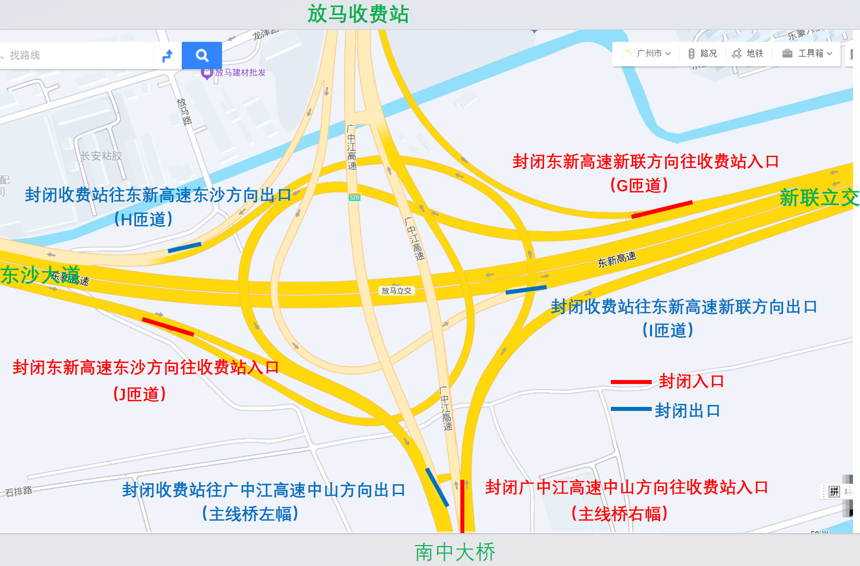 具体禁闭区域为广中江高速干线往放马收费站主意匝说念收支口、东新高速东沙大路主意和新联立交主意往放马收费站匝说念收支口,以上区域实验全禁闭,退却通盘车辆通行(辖区高速公路贬责、施工车辆以外)。交通照看工夫为2025年11月4日10时起至2027年12月31日10时止,为期787天。
